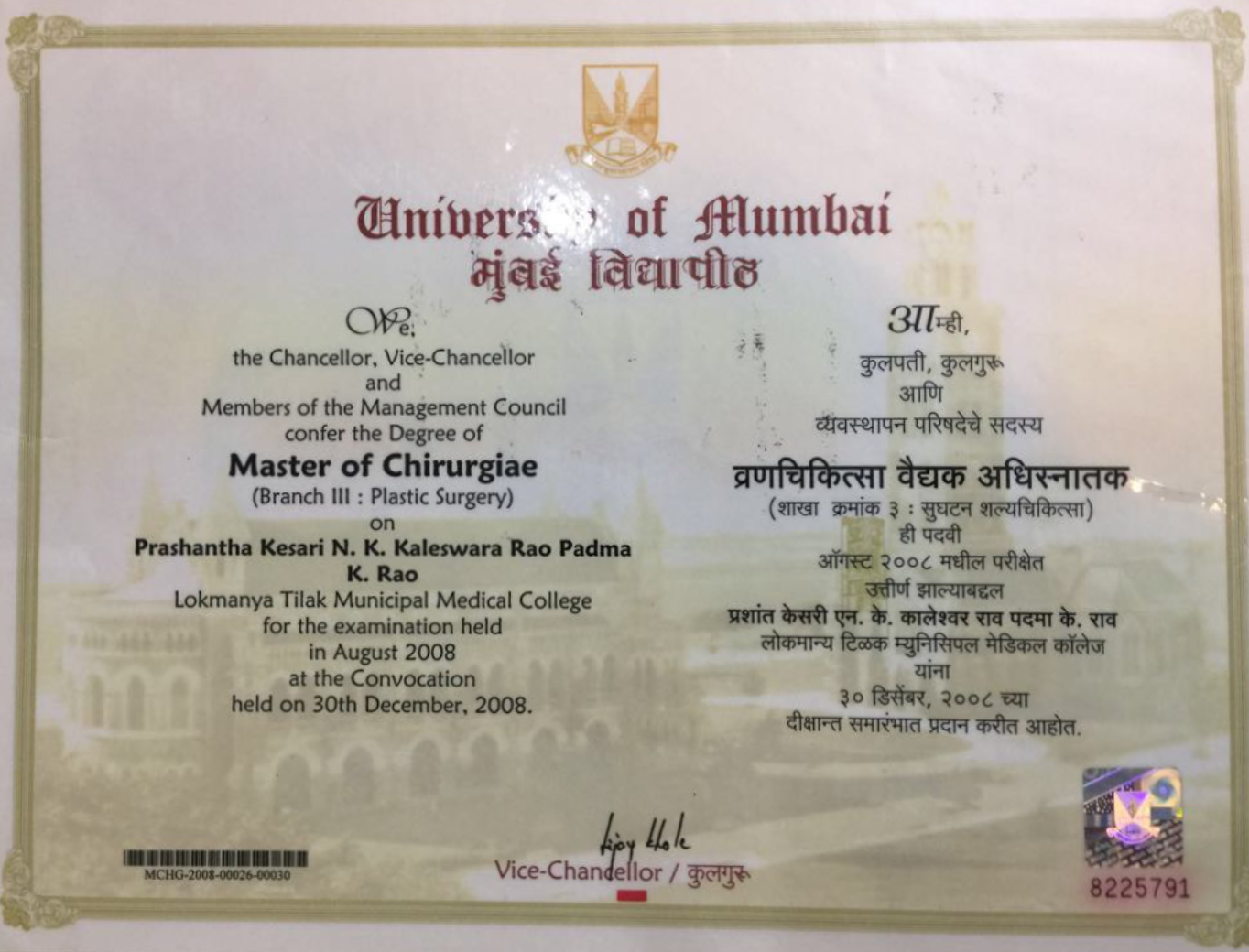 Dr. Prashantha Kesari completed an Advanced Fellowship in Cosmetic and Laser Surgery at a top cosmetic surgery center. He received comprehensive Plastic Surgery training at LTM Medical College (Sion Hospital), renowned as the best center for Plastic Surgery training in the country. Sion Hospital has a legacy of producing many distinguished experts in the field.
